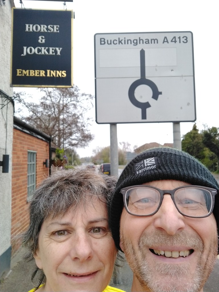 Stopped off in Aylesbury outside a suitably named pub. A passing motorist honked and waved at us as we were posing for this picture. Either he was applauding us for starting a queue, early, for when the pub opens on Monday or…(as I prefer to think) it was that he recognised the parkrun Tee.