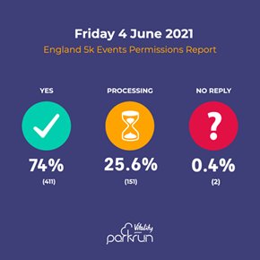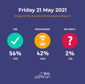 Not unexpectedly, parkrun HQ announced on 21st May that the parkrun restart in England would be rolled forward to 26th June. Two weeks on from then, and there has been a massive 18% jump in the number of “Yes” replies received from Landowners. Will we get to the (undisclosed) critical mass percentage by next Friday?…Here’s hoping.