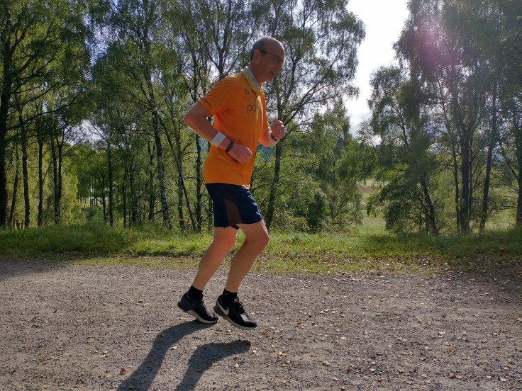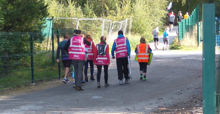 Fast forward to the following morning and Team Bishop rock up to the appointed place just before the appointed hour or, in this case, just before half-past-the hour (parkruns in Scotland start at 9:30am). We park the car and follow the hi-viz heroes away from the rendezvous point by the café, past a lock-up for the local coach company then, just as the Speyside Way path begins at a wooded area, we congregate in expectation of the abridged run briefing.
