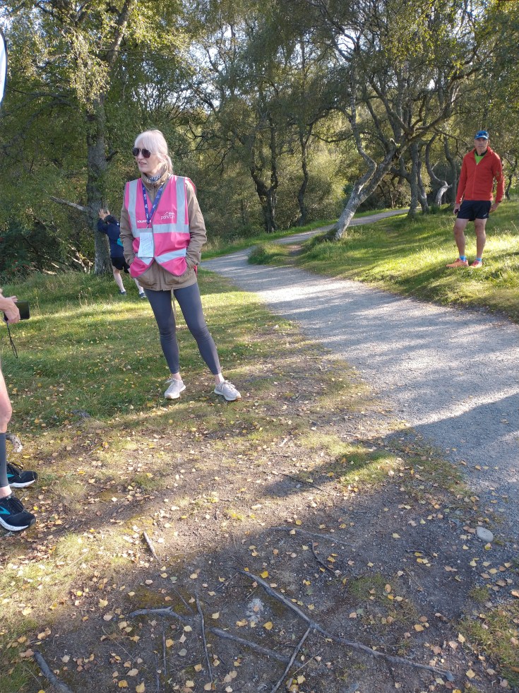 Then off through the woods, along the sun-dappled path….(definitely a “road shoes course” in all weathers – except perhaps in snow). Oh look! Some marshalls-in-disguise are cheering on the front runners 😉 as they pass.
