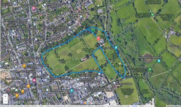 Then last October, I took part in my first Half Marathon event located in and around Oxford city centre. Kilometre 18 and 19 of the 21.08 km course meandered its way through University Parks, tantalisingly near to the finish line in Parks Round, and yet still another 2km to go. I well remember the blend of exhilaration and exhaustion at this point. My pace was flagging, but I still kept willing myself on to the end, imagining that I was (“only”) at a parkrun, 3km done, and “just” another less-than-half a parkrun to go, with perhaps enough left in the tank for a cheeky sprint in the last 100m to the finish.