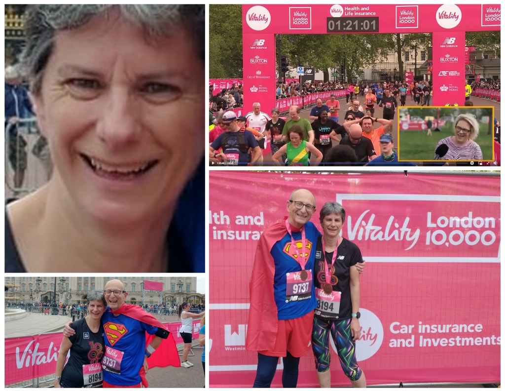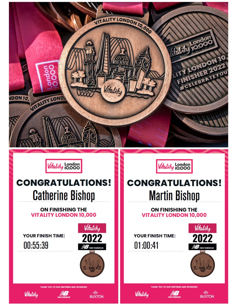 Proud to say that Cathy posted a PB of 55:42 for this event, shaving a massive 1:49 from her previous PB in 2019. I also got my best time (so far on the London course) of 1:00:41, tantalisingly close to a sub-hour. Like fine wines, we both appear to be improving with age. (Btw, the time on the finish gantry, in the photo below, is gun time, and not chip time).