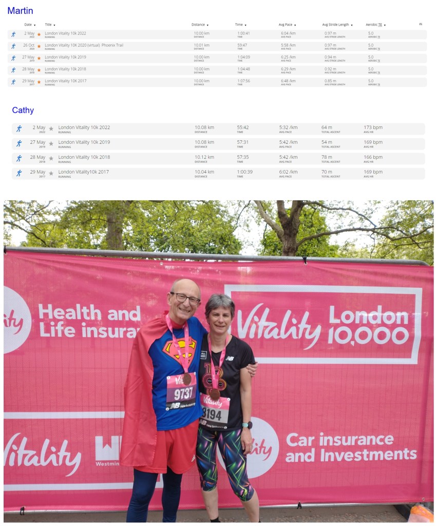 My fifth time at this event. Great to be back in London, post COVID. Great to be starting in The Mall and finishing in front of Buckingham Place on this special year for Queen Elizabeth. There is little prospect of me signing up for the actual London Marathon any time soon, however this 10K event gives me a taste of running along the streets of London in the same event as the Elite runners.