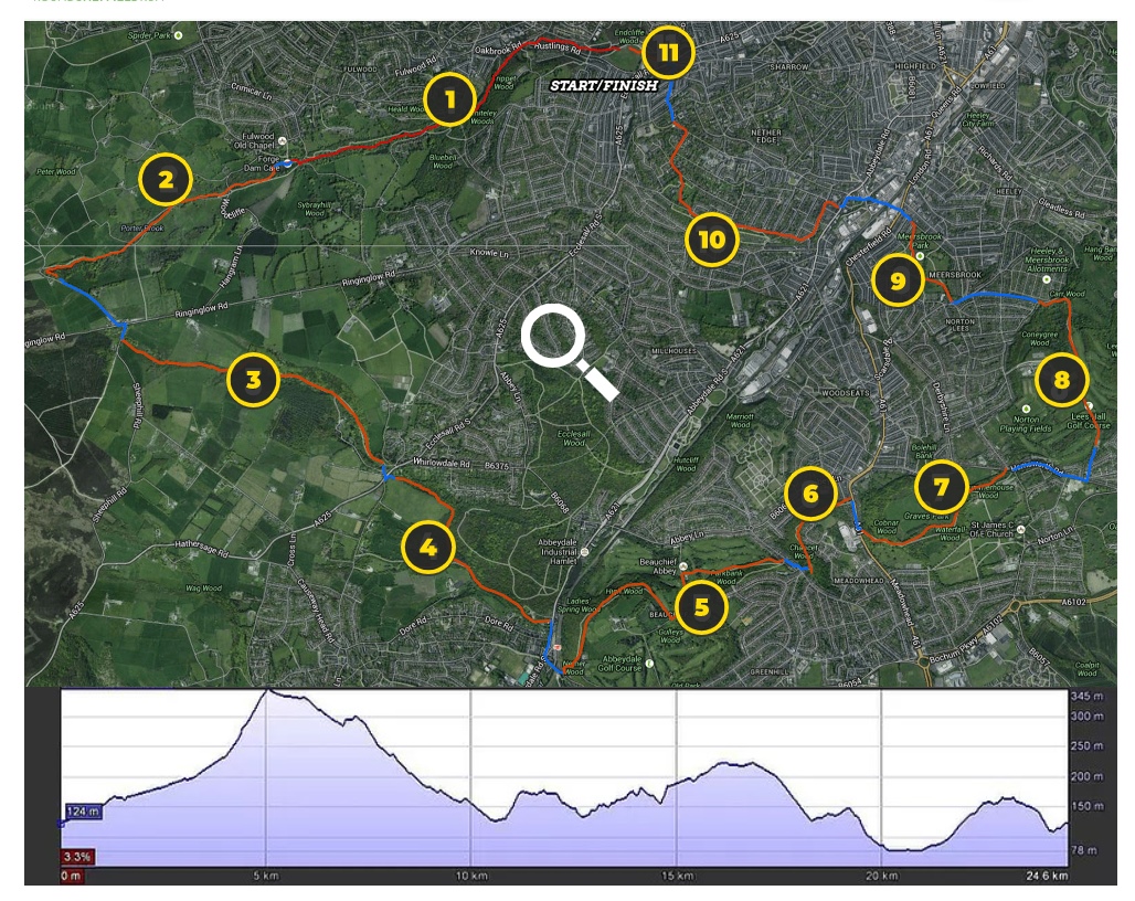 Now…the reason why I mention both of these Sheffield attributes is to segue to a third, and arguably, the best unique quality of this city namely: the Round Sheffield Run. This is a 20k “multi-stage trail running experience” over a 24km route round the South West quadrant of Sheffield. It follows a variety of surfaces, (tarmac, hard-packed gravel, and forest trails) taking in open countryside, wooded trails and public parks: an unique combination of terrains and undulations (!). The route has been “hand-crafted” to show off Sheffield’s environs at its best. And if the hills don’t take your breath away, then the views from the high points of the course certainly will.